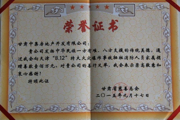 2015年8月12日23時30分,天津濱海新區(qū)國際物流中心發(fā)生重大爆炸火災事故,造成重大人員傷亡。甘肅中集房地產(chǎn)開發(fā)有限公司總經(jīng)理周啟濤獲悉后,決定為在本次事故中犧牲的消防官兵及其家屬捐款100萬元,用于幫助犧牲消防官兵家屬善后事宜的處理,以盡一份甘肅企業(yè)的慈善愛心。