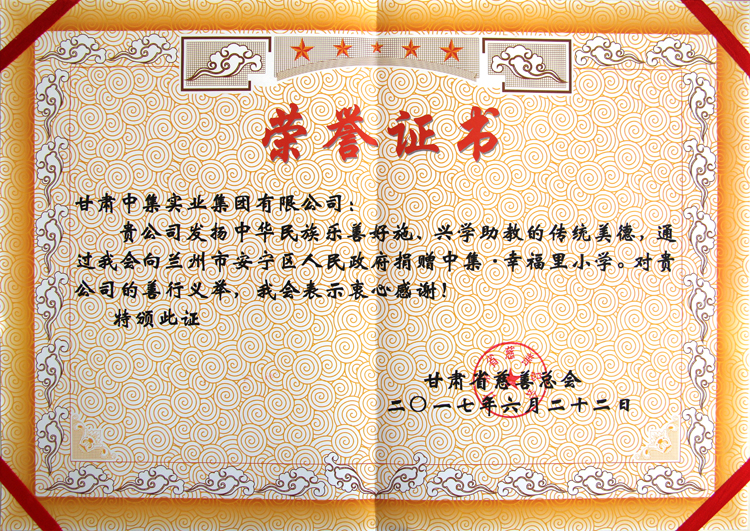 甘肅省慈善總會(huì)朱志良會(huì)長(zhǎng)向甘肅中集實(shí)業(yè)集團(tuán)有限公司董事長(zhǎng)周啟濤頒發(fā)榮譽(yù)證書(shū)